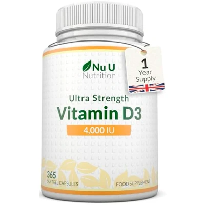 QUADRUPLE STRENGTH D3 - Our ultra strength Vitamin D3 4000 IU supplement is one of the most powerful formulations available. Offering FOUR TIMES the strength of regular vit d products which offer 1000 IU per softgel you would need to take 4 to achieve the same dosage. Our one a day, small softgels are easy to swallow and offer a convenient way to take vitamin D3. 12 MONTH'S SUPPLY - We offer an incredible 365 softgels per bottle. UNBEATABLE VALUE keeping you replenished with Vitamin D for a FULL YEAR. You won’t have to worry about running out or reordering until next year with our 52 week supply. D3 WITHOUT THE SUN - Sunlight is the most common source of Vitamin D but most people don’t get enough exposure to remain healthy. Our Vitamin D3 from cholecalciferol is the same form of Vit D your skin cells produce naturally when exposed to sun. Vitamin D3 is vital and contributes to the maintenance of normal bones, teeth, muscle function and the normal absorption/utilisation of calcium and phosphorus*. (*EFSA approved claims.) UK MADE PRODUCT - Our Vitamin D is made in the UK to current GMP standards. We ensure all our products meet stringent UK/EU legislation to maintain a high level of health and safety standards. We provide genuine quality assurance; we want you to be satisfied! THE NU U NUTRITION STORY - TRUSTED SUPPLIER OF NUTRITIONAL SUPPLEMENTS - Starting as a family business in 2014, we’ve expanded to offer a diverse range of high-quality supplements designed to support different lifestyles. Our mission is to make wellness simple, with premium ingredients that cater to your daily nutritional needs—whether for general health or targeted goals.