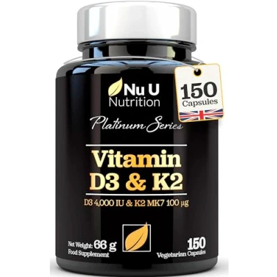 𝗨𝗡𝗥𝗜𝗩𝗔𝗟𝗟𝗘𝗗 𝗩𝗔𝗟𝗨𝗘 - We offer a staggering 150 D3 & K2 capsules per bottle for a full 5 month’s supply. Most other supplements offer only half that amount. We offer only the very best ingredients which have been manufactured in the UK to strict guidelines. In addition our capsules are free from common allergens including: milk, cereals, nuts, crustaceans and molluscs, egg and soy. 𝗘𝗦𝗦𝗘𝗡𝗧𝗜𝗔𝗟 𝗡𝗨𝗧𝗥𝗜𝗘𝗡𝗧𝗦 - We keep it simple. Our Platinum Series Vitamin D3 and K2 supplement offers two essential vitamins in one convenient capsule. Both at optimum dosages to ensure safe and lasting results. We use only premium NON-GMO ingredients from natural sources (lanolin and natto) in our capsules which have also been designed to be easy to take and readily absorbed. 𝗗𝟑 𝗪𝗜𝗧𝗛𝗢𝗨𝗧 𝗧𝗛𝗘 𝗦𝗨𝗡 - Sunlight is the most common source of Vitamin D but most people don't get enough exposure to it to remain healthy. Our Vitamin D3 from cholecalciferol is the same form of Vit D your skin cells produce naturally when exposed to the sun. Vitamin D3 is vital to our bodies and contributes to the maintenance of normal bones, teeth, muscle function as well as the normal absorption/utilisation of calcium and phosphorus. 𝗦𝗨𝗣𝗣𝗢𝗥𝗧 𝗙𝗢𝗥 𝗬𝗢𝗨𝗥 𝗕𝗢𝗡𝗘𝗦 - Vitamins D3 and K2 both aid with the maintenance of normal bones as approved and verified by the ESFA (European Food Safety Authority.) The two vitamins work in harmony with one another to ensure that calcium is directed into the bones where it helps improve bone density. Without enough vitamin K2 calcification within the arteries can occur, increasing the risk of heart disease. 𝗣𝗟𝗔𝗧𝗜𝗡𝗨𝗠 𝗥𝗔𝗡𝗚𝗘 𝗡𝗘𝗫𝗧 𝗟𝗘𝗩𝗘𝗟 𝗦𝗨𝗣𝗣𝗟𝗘𝗠𝗘𝗡𝗧𝗔𝗧𝗜𝗢𝗡 - At Nu U Nutrition your health is important to us. Our research and development team have spent over 12 months developing a range of world-class supplements using only the finest ingredients and most bio-available formulations that are backed by scientific and clinical studies. We do all this because we believe in your health and a Nu U.