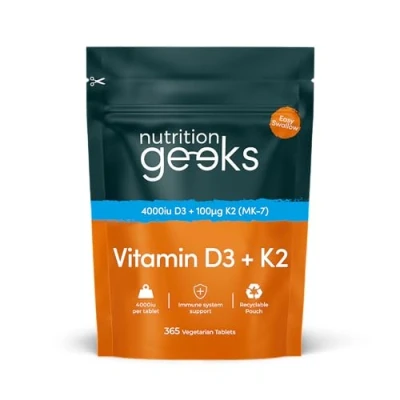 Why Choose Nutrition Geeks Vit D3 K2: Get 2X more than other brands with a year's supply of 365 tablets in a pouch. Each tablet combines Vitamin D 4000 iu with 100μg of K2. Vit D is crucial for bone health and immune support, while Vitamin K2 ensures calcium is deposited in your bones and not the arteries. Our Vitamin D3 and K2 high strength formula is designed for optimal absorption and efficacy. Easy to Swallow With No Aftertaste: Our Vitamin D K2 tablets have been uniquely formulated to be just 6mm in diameter - so small you won't even notice when you swallow them! Letterbox Friendly and Great Value for Money: Our slim packaging makes our Vitamin D and K2 easy to store and cost-effective to post unlike other bottled high strength vitamin d & K2 vitamin supplements including vitamin d spray & vitamin d drops. Vegetarian Vitamin D3 Tablets & Allergen Free: We understand the importance of providing vitamin d supplements that cater to everyone's needs; are sourced & produced ethically AND at an accessible price to customers. Our tablets are Gluten-free, Dairy-free, Cruelty-free. Scientifically Proven Supplements Uncomplicated, So You Can Get The Most Out of Life. Accessible to Everyone. Delivered To You Sustainably: Good health is a need not a want. We are on a mission to make quality, science backed nutrition sustainably accessible to everyone. Less plastic, less waste. We have also committed to be the UK's leading sustainable supplement provider with a Net Zero target.