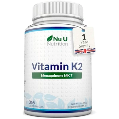 ✔ HIGH STRENGTH VITAMIN K2 - Each serving provides 200mcg of Vitamin K2 MK7, this is TWICE the strength of other Vitamin K complex supplements. We also provide Vitamin K2 MK-7 Menaquinone the highly bioactive form of Vitamin K2, known as the gold standard of Vitamin K2. ✔ 12 MONTH'S FULL SUPPLY - Our market leading supply of 365 Vitamin K2 supplement gives amazing VALUE providing a full 12 months supply. This is FOUR TIMES the amount of many leading supplements. No need to remember to reorder every month with our 52 weeks supply. ✔ HELPS WITH - Vitamin K contributes to normal blood clotting and the maintenance of normal bones. *EFSA approved claim. ✔ VEGAN FRIENDLY - Our easy to swallow vitamin k2 tablets are suitable for vegans and vegetarians. Ideal for men and women seeking to complement their daily diet with a reliable source of Vitamin K2. Suggested use: Take 1 tablet per day or as directed by your healthcare professional with food and water. ✔ THE NU U NUTRITION STORY - TRUSTED SUPPLIER OF NUTRITIONAL SUPPLEMENTS - Starting as a family business in 2014, we’ve expanded to offer a diverse range of high-quality supplements designed to support different lifestyles. Our mission is to make wellness simple, with premium ingredients that cater to your daily nutritional needs—whether for general health or targeted goals.