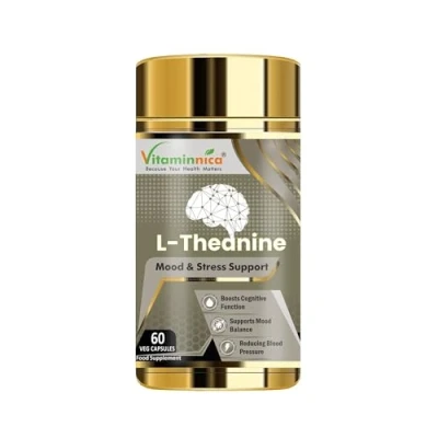 Vitaminnica L-Theanine promotes relaxation and reduces feelings of stress and anxiety without causing drowsiness, allowing you to remain calm and focused during times of mental or emotional pressure. It helps improve sleep quality by promoting relaxation and reducing anxiety, making it easier to fall asleep and stay asleep throughout the night. Benefits: -> Supports Relaxation -> Supports Mood Balance -> Improves Sleep Quality -> Enhances Cognitive Function -> Supports Cardiovascular Health Direction to use: Consume 1 capsule with water every day, preferably after the meal. Do not exceed recommended intake unless advised or directed by a professional healthcare. 3rd PARTY LAB-TESTED SUPPLEMENT: The high potency dietary supplement is manufactured in accordance with GMP manufacturing practices and is guaranteed for purity and potency. To further ensure purity, safety, and potency, the capsules are 3rd party lab-tested. HIGH POTENCY FORMULA: The convenient, easy to swallow dietary supplement is highly bioavailable, supports maximum assimilation and absorption. Each serving provides 1000mg of this amino acid. The supplement comes packed in a plastic bottle that is made of food-safety graded HDPE.