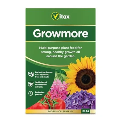 GENERAL PURPOSE FERTILISER: Vitax Growmore is a popular, all-purpose fertiliser designed to support strong and healthy plant growth throughout your garden. FAST ACTING: Vitax Growmore Fertiliser Delivers quick results, boosting plant development and enhancing growth rates. VERSATILE USE: Suitable for fruits, vegetables, and flowers, Vitax Growmore is also ideal for use before laying turf or sowing grass seed, ensuring optimal soil preparation. HEAVY CROP PROMOTION: Encourages heavy crops of fruit and vegetables, vigorous plant growth, and vibrant flowers, making it a comprehensive choice for various garden needs. EASY APPLICATION: Apply evenly and fork or hoe into the top surface of the soil. Reapply every 8-10 weeks as a top dressing, avoiding contact with leaves and stems for best results. Contains superphosphate and nitrogen for balanced nourishment., Weight: 2.20462262 Pounds, Manufacturer: Vitax