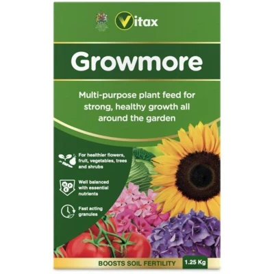 General description Vitax Growmore is a highly effective general-purpose fertilizer designed for strong, healthy plant growth. It is suitable for use all around the garden and greenhouse, making it ideal for promoting heavy crops of fruit and vegetables, as well as vigorous plants and beautiful flowers. Additionally, it is perfect for use before laying turf or sowing grass seed. Technical specifications Pack size: 1.25kg NPK: 7-7-7 MPN: 6GR126 EAN: 5012351071214 Usage Apply evenly at the recommended rates in the spring and throughout the growing season. Hoe or fork the granules into the top surface of the soil, and if the soil is dry, water well for maximum benefits. Other information