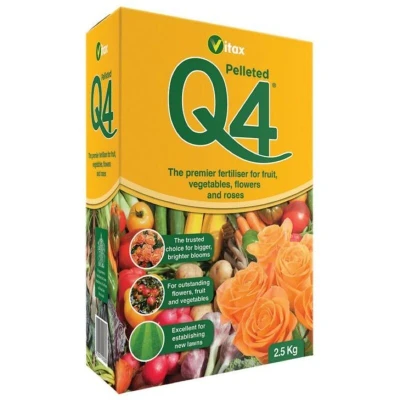Vitax Q4 Fertiliser Size: 2.5kg This all purpose pelleted fertiliser for plants, roses, fruit, flowers, vegetables and new lawns has been a favourite with amateur and professional gardeners for many years. It contains the vital nutrients and trace elements essential for plant growth and flower formation.