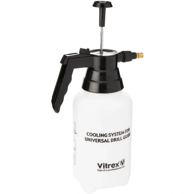 General description This Vitrex water cooling system is an essential piece of equipment designed to prevent drill bit damage through overheating. It is specifically ideal for use with Vitrex hard tile drill bit guides, helping to maintain optimal drilling performance. Technical specifications Includes a trigger control with a lock for continuous water flow Operates with a simple plunger mechanism to build up pressure Supplied with a plastic pipe for easy connection Compatibility and accessories Compatible with Vitrex hard drill bit guides Includes a plastic pipe for connection Installation Connect the plastic pipe to the water cooling system and the drill guide as instructed Use the trigger control to start or stop water flow as needed Usage Use during drilling to keep the drill bit cool and prevent overheating Engage the trigger control for continuous water flow or lock it for hands-free operation
