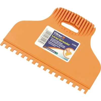 General description The Vitrex Large Spreader is a strong, flexible plastic tool designed for fast adhesive application. Its notched edge ensures even and efficient spreading, making it ideal for various tiling projects. The contoured handle provides extra comfort and better leverage during use, allowing for professional results. Technical specifications Material: Strong, durable plastic Size: Large surface area for efficient coverage Notched edge for even adhesive application MPN: 102961 EAN: 5011204601189 Compatibility and accessories Compatible with standard tile adhesives Suitable for use with various tile sizes and types Installation No installation required. Usage Apply tile adhesive with the notched side of the spreader Use the contoured handle for a comfortable grip and leverage Ensure an even layer of adhesive for proper tile adhesion Other information
