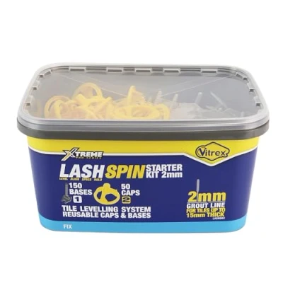 The Vitrex LASHSPIN Tile Levelling System is an enhanced, spin-style version of the original Vitrex LASH system. Featuring a quick-install Spin Cap and interchangeable bases for 2mm or 3mm grout lines, its designed for speed, precision, and ease of use. Ideal for large-format tiles, including porcelain, marble, and stone, LASHSPIN completely eliminates tile lippage and ensures a perfectly level finish on both walls and floors. The system adjusts tile height and maintains consistent edge alignment throughout the curing process. Fast, reliable, and cost-effective, LASHSPIN is the go-to solution for professional-grade tile levelling. The Vitrex LASHSPIN Starter Kit 2mm contains 150 Bases and 50 Caps.