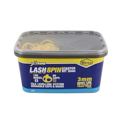 The Vitrex LASHSPIN Tile Levelling System is an enhanced, spin-style version of the original Vitrex LASH system. Featuring a quick-install Spin Cap and interchangeable bases for 2mm or 3mm grout lines, its designed for speed, precision, and ease of use. Ideal for large-format tiles, including porcelain, marble, and stone, LASHSPIN completely eliminates tile lippage and ensures a perfectly level finish on both walls and floors. The system adjusts tile height and maintains consistent edge alignment throughout the curing process. Fast, reliable, and cost-effective, LASHSPIN is the go-to solution for professional-grade tile levelling. The Vitrex LASHSPIN Starter Kit 3mm contains 150 Bases and 50 Caps.
