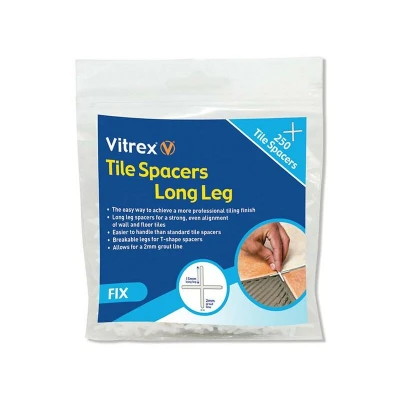 General description These Vitrex Long Leg Spacers provide an easy way to achieve a professional tiling finish by ensuring consistent and even spacing between tiles. They are designed to create a 2mm grout line, allowing for a uniform and accurate grout line. Technical specifications Size: 5mm Pack Quantity: 250 pieces Part Number: LLS5250 EAN: 5011204614554 Compatibility and accessories Suitable for use with various tile types and sizes Compatible with other tile spacers and tiling tools Installation Place the spacers between tiles during installation to maintain consistent grout lines Use the breakable legs to create T-shaped spacers for specific tile arrangements Remove the spacers after the adhesive has set before grouting Usage Ideal for professional and DIY tiling projects Ensures uniform grout lines for a neat finish Other information