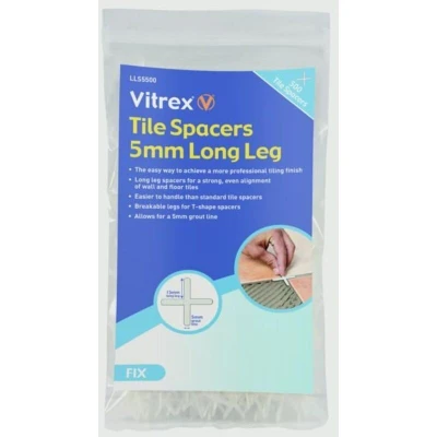General description These Vitrex Long Leg Spacers provide an easy way to achieve a more professional tiling finish. They ensure a constant and even spacing of tiles, allowing for the specified size in grout lines. The spacers feature easily breakable legs for T-shaped spacers, making them easier to handle than standard tile spacers and allowing for a 2mm grout line. Supplied in a resealable bag, this pack contains 500 spacers. Technical specifications Size: 5mm Pack Quantity: 500 pieces Material: Plastic MPN: LLS5500 EAN: 5011204614561 Compatibility and accessories Compatible with standard tiles for indoor tiling projects Can be used with other tile spacers or tiling tools for professional results Installation Insert the spacers between tiles during installation to maintain consistent grout lines Break off the legs if T-shaped spacers are needed for corner or edge tiles Ensure even spacing by placing spacers at regular intervals across the surface Usage Use during tile laying to