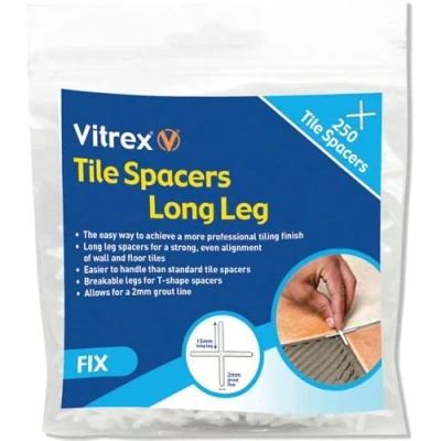 General description These Vitrex Long Leg Spacers help achieve a professional tiling finish by providing consistent and even tile spacing. They ensure the grout lines are of the specified size, making your tiling work neat and precise. The spacers feature easily breakable legs for T-shape spacers, which are easier to handle than standard tile spacers. They allow for a 2mm grout line, suitable for various tiling projects. Technical specifications Size: 3mm Pack Quantity: 250 spacers Material: Plastic Compatibility and accessories Compatible with standard tiles and grout lines Suitable for use with various tiling tools and accessories Installation Place the spacers between tiles during installation to maintain consistent spacing Break off the legs if needed to fit specific tile arrangements Usage Use during tile laying to ensure uniform grout lines Handle with care to avoid damaging the breakable legs Other information Supplied in a resealable bag for easy storage and reuse