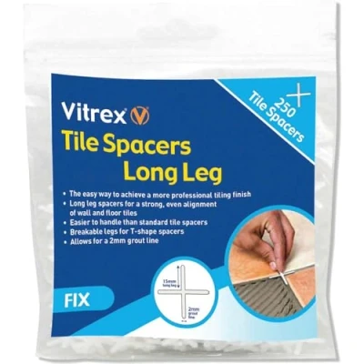General description These Vitrex Long Leg Spacers are designed to help achieve a professional and even tiling finish. They ensure consistent spacing between tiles, matching the specified grout line size. The spacers feature easily breakable legs for T-shaped spacers, making them easier to handle than standard tile spacers. They are suitable for creating a 2mm grout line and are supplied in a resealable bag for convenience. Technical specifications Size: 4mm Pack Quantity: 250 pieces Compatibility and accessories Compatible with standard tiles and grout lines of 2mm Suitable for use with various tiling tools and accessories for professional results Installation Place the spacers between tiles during installation to maintain consistent spacing Break off the legs if necessary to achieve T-shaped spacers for better handling Usage Use the spacers to ensure uniform grout lines when laying tiles Handle with care to avoid damaging the breakable legs Other information Supplied in a resealable