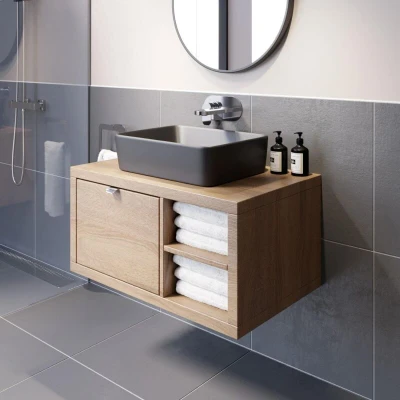 Vitusso® 800mm Bathroom Vanity Unit Countertop Basin Sink Wall Hung Drawer with Shelves Storage Oak Wood, Croix Black RH