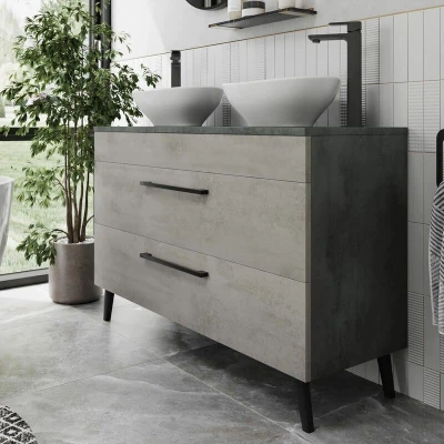 General description This Bathroom Vanity Unit features a double basin sink cabinet with a modern design, perfect for creating a personal space or sharing with a partner. The unit is wall-hung and offers flexibility for either a single or double bowl basin. Its stylish two-tone finish combines a raw grey concrete look with complementing anthracite accents, providing a contemporary aesthetic for any bathroom. Technical specifications Overall Width: 1200mm Overall Height: 767mm Overall Depth: 420mm Material: Chipboard structure with melamine surface Basin Material: Ceramic Basin Shape: Round Finish: Matte Soft Close Drawers: Yes Soft Close Doors: No Assembly: Pre-Assembled Installation Type: Wall Hung or Floor Standing Handle Style: Straight Long Bar Installation The vanity unit comes fully assembled, allowing for easy installation. You can choose to mount it on the wall or use the included stylish black legs for a freestanding option. Simply unbox the unit and mount it to your wall