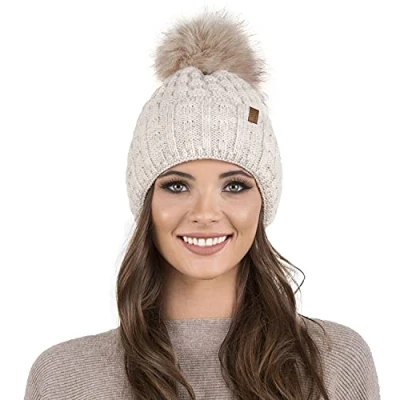 Vivisence Winter Womens Elegant Hat with Pom Soft Fleece Lining for Ladies Warm and Comfortable Perfect Cold Days Everyday Wear, Beige,UNI