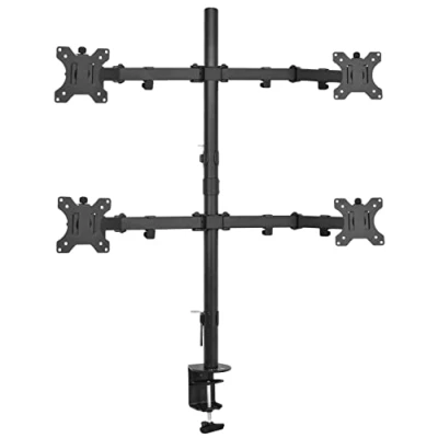 Fits 13" To 30" Screens - Quad monitor mount fitting most screens 13” to 30” in size and up to 8 kg in weight (each) with VESA 75x75mm or 100x100mm hole patterns. Mounts to your desk with heavy duty C-clamp or option grommet fitting desks from 1 cm to 8.4 cm in thickness. Articulation & Height Adjustment - Enjoy comfortable viewing angles with +80° to -90° tilt, 180° swivel, 360° rotation, and height adjustment along the center pole. Monitors can be placed in portrait or landscape orientation. Integrated Cable Management - Keep your power and AV cables clean and organized with detachable cable clips on the arms and center pole. Easy Installation - Mounting your monitors is a simple process with detachable VESA plates. We provide all the necessary hardware and instructions for easy assembly. We've Got You Covered - Sturdy steel design is backed with a 3 Year Manufacturer Warranty and friendly tech support to help with any questions or concerns.