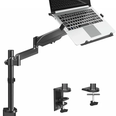Fits 10” to 15.6” Laptops: Single universal laptop mount fits most laptops and notebooks 10” to 15.6” and up to 9.9 lbs. The stand uses 75x75mm or 100x100mm VESA patterns and secures to a desktop up to 3.5” thick with a heavy duty C-clamp or grommet Articulation: The adjustable pneumatic arm and mounting bracket offer +35° to -35° tilt, 180° swivel, and 360° rotation. Please Note: The counterbalance arm must have at least 2.2 lbs in weight to work properly Height Adjustment: Innovative design features smooth height adjustment that perfectly counterbalances the weight of your laptop (maximum center of screen height is 23.6”) Ventilated Tray: Features an adjustable clamp design that fits a variety of laptop sizes. Rubber tabs keep your device secure and protected from scratches, while the ventilation slots allow maximum airflow to keep your laptop from overheating Easy Installation: Mounting your laptop is a simple process with the removable VESA plate. We provide all the hardware and instructions for easy assembly