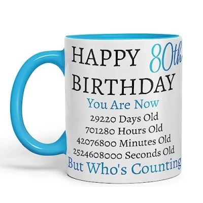 Vixar But Who's Counting Happy 80th Birthday Ceramic Coloured Mug Cup Gift Days Hours Minutes (Blue)