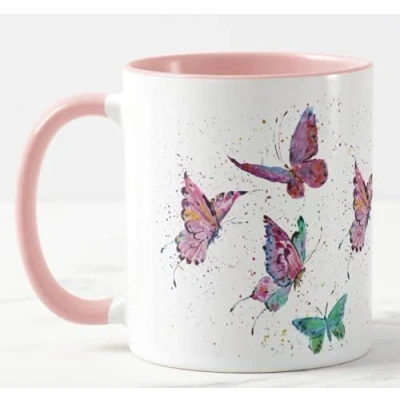 Vixar Butterfly Watercolour Art Coloured Mug Cup, Gift, Birthday, Work, Office, Christmas Tea Coffee (Pink)