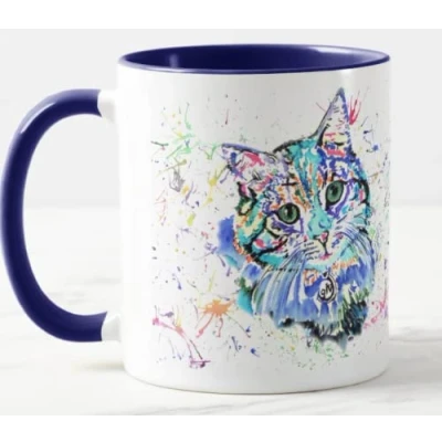 Vixar Cat Blue Feline Pet Watercolour Rainbow Art Coloured Mug Cup Gift Birthday Work Office Christmas Tea Coffee (Navy)