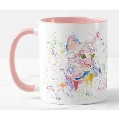 Vixar Cat Kitten Feline Pet Watercolour Rainbow Art Coloured Mug Cup Gift Birthday Work Office Christmas Tea Coffee (Pink)