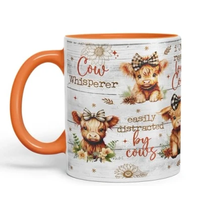 Vixar Easily Distracted by Baby Cow Whisperer I just Realy Love Highland Scottish Farm Animals Ceramic Coloured Mug Cup for Tea Coffee Hot Brew 330ml 11Oz Gift (Orange)