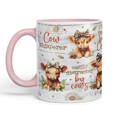 Vixar Easily Distracted by Baby Cow Whisperer I just Realy Love Highland Scottish Farm Animals Ceramic Coloured Mug Cup for Tea Coffee Hot Brew 330ml 11Oz Gift (Pink)