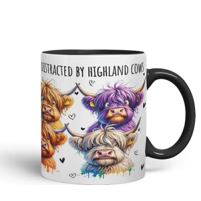 Vixar Easily Distracted by Highland Cows Scottish Farm Animals Ceramic Coloured Mug Cup for Tea Coffee Hot Brew 330ml 11Oz Gift (Black)