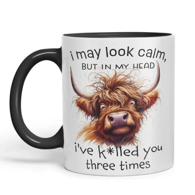 Vixar I May Look Calm, but in My Head I've k*lled You Three Times Highland Cow Joke sarkasm Sarcastic Ceramic Coloured Mug Cup for Tea Coffee Hot Brew 330ml 11Oz Gift (Black)