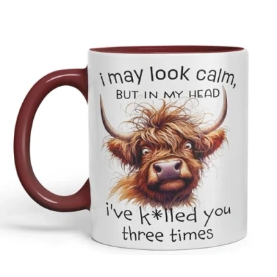 Vixar I May Look Calm, but in My Head I've k*lled You Three Times Highland Cow Joke sarkasm Sarcastic Ceramic Coloured Mug Cup for Tea Coffee Hot Brew 330ml 11Oz Gift (Maroon)