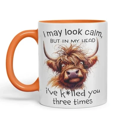 Vixar I May Look Calm, but in My Head I've k*lled You Three Times Highland Cow Joke sarkasm Sarcastic Ceramic Coloured Mug Cup for Tea Coffee Hot Brew 330ml 11Oz Gift (Orange)