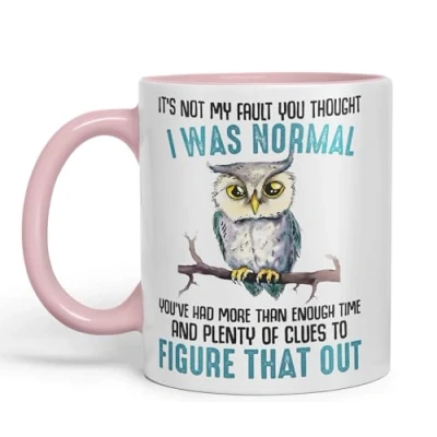 Vixar It's Not My Fault YouThought I was Normal, Owl Sarcastic Joke Ceramic Coloured Mug Cup for Tea Coffee Hot Brew 330ml 11Oz (Pink)