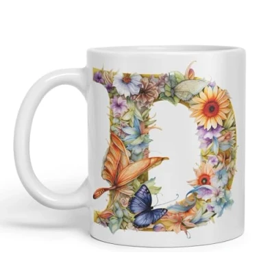 Vixar Letter D Mug, Floral Flowers Butterfly Alphabet Monogram Watercolour Ceramic Coloured Mug Cup for Tea Coffee Hot Brew 330ml 11Oz Gift (White)