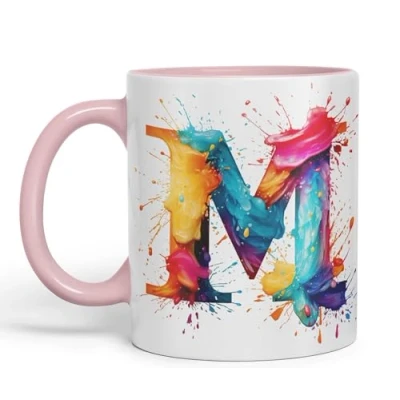 Vixar Letter M Mug, Alphabet Monogram Watercolour Ceramic Coloured Mug Cup for Tea Coffee Hot Brew 330ml 11Oz Gift (Pink)
