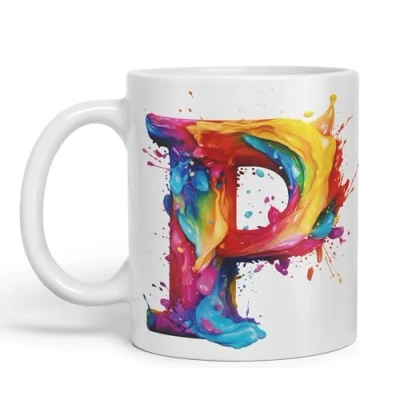 Vixar Letter P Mug, Alphabet Monogram Watercolour Ceramic Coloured Mug Cup for Tea Coffee Hot Brew 330ml 11Oz Gift (L Blue)