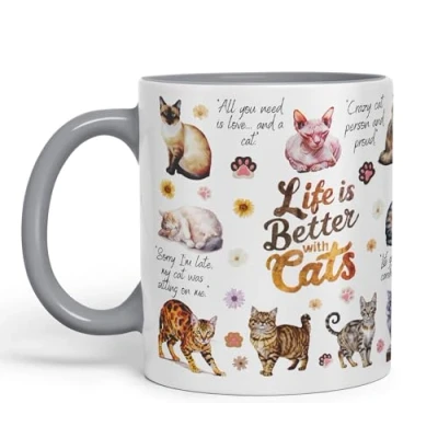 Vixar Life is Better with Cats Joke Pets kittten Ceramic Coloured Mug Cup for Tea Coffee Hot Brew 330ml 11Oz Gift (Grey)