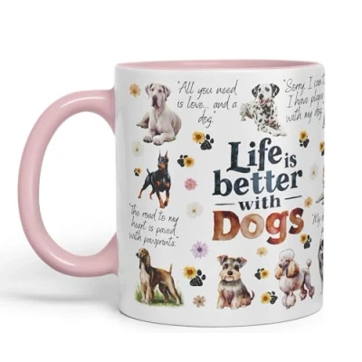 Vixar Life is Better with Dogs Joke Pets Ceramic Coloured Mug Cup for Tea Coffee Hot Brew 330ml 11Oz Gift (Pink)
