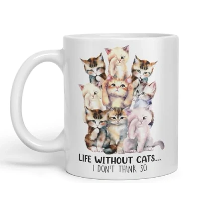 Vixar Life Without Cats… I Don't Think so, cat Sarcastic Joke Ceramic Coloured Mug Cup for Tea Coffee Hot Brew 330ml 11Oz