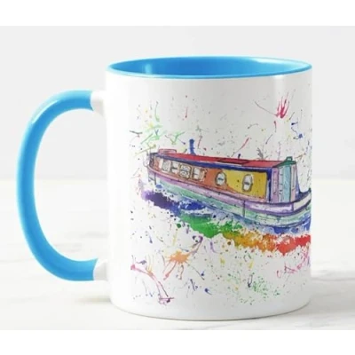 Vixar Narrowboat Canal Boat Watercolour Art Coloured Mug Cup Gift Birthday Work Office Christmas Tea Coffee (L Blue)