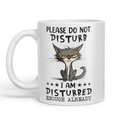 Vixar Please Do Not Disturb, I am Disturbed Enough Already Cat Joke Ceramic Coloured Mug Cup for Tea Coffee Hot Brew 330ml 11Oz (White)