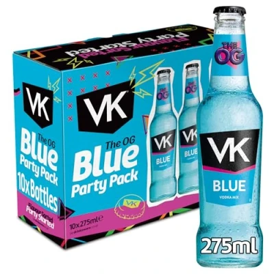 🔵VK BLUE, VODKA BASED, READY TO DRINK ALCOPOP🔵 A sparkling mixed fruit flavoured vodka drink, including caffeine. The number one for students for 10 YEARS running! 💙 PERFECT PARTY STARTING 10 x 275ML BLUE MULTIPACK 💙 A multipack of the OG VK Blue meant to be shared with your mates at pre-drinks or for the main party. It’s the go-to choice for VK pong! Perfect for creating Venoms. 🫧TINGLE YOUR TASTE BUDS🫧 start your weekend right with the fizzy feeling of the OG VK Blue. The perfect sparking vodka drink thats packed with mixed berry flavour. Premixed alcoholic drink that tastes amazing! 🍹MIX IT UP IN COCKTAILS🍹 create flavour sensations to impress your mates and level-up your party. We love VK Blue in a Cheeky V or Blue Lagoon. 😎 EASY TO DRINK 3.4% 😎 An all night alcopop choice with a fruity mixed berry flavour that is super easy to drink in a 275ml bottle, designed for the dance floor.