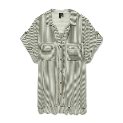 Classic short-sleeve shirt with vertical stripes and two chest pockets. Stylish design with rolled-up sleeves and decorative button placket. Ideal for casual office outfits or relaxed weekend activities. Lightweight material provides comfort and freedom of movement. 95 percent polyester women