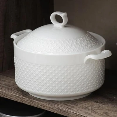 Material. This soup tureen has been constructed with a sturdy ceramic body, which is heavy duty, heat-resistant, reusable Soup Tureen With Lid And Ladle Set. Including ceramic serving tureen, glass lid and white ceramic ladle. Microwave & dishwasher refrigerator & oven is safe Note: do not heat directly on heat sources! Wide Use. Perfect for soup,stew, noodles, pasta, fruit, salad and more. Embossed square patterns are beautiful and elegant, making it an essential decoration for kitchens, parties, home, and restaurants. Versatile Utility: This ceramic stew pot create a wide range of delicious soups, stews, and desserts, catering to various culinary desires., Weight: 4.40924524 pounds, Manufacturer: Vnook