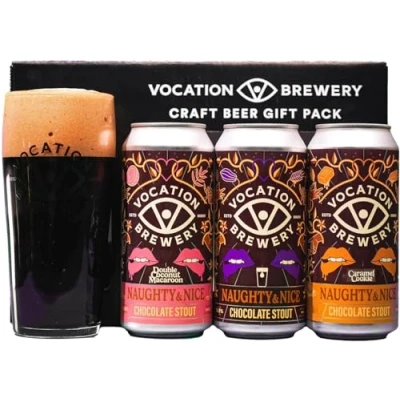 Contains 3 x 440ml Craft Beer Cans & 1 x Vocation branded pint glass Each Pack Contains: 1 x Naughty & Nice 5.9% Chocolate Stout, 1 x Naughty & Nice 6% Double Dipped Coconut Macaroon Stout, 1 x Naughty & Nice Sweet Temptation 6.6% Chocolate Caramel Stout and 1 x Vocation 'Billy' 20oz Pint Glass Packaged in our premium gift pack The perfect gift for birthday's, Father's Day, Christmas birthdays, or special occasions, this unique gift is sure to delight and impress.