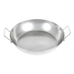63(H) x 382(Ø)mm . 2½(H)" x 15(Ø)". Carbon Steel. Black. Even heat distribution across the whole pan surface. Strong metal handles with hanging hole for easy storage. Oven safe. Hand wash only. Please note: requires seasoning before use.
