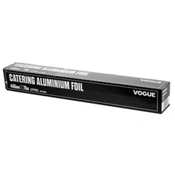 LONG-LASTING VALUE: Each roll of Vogue Aluminium Foil lasts longer with a generous 75m length EXTRA-WIDE COVERAGE: Perfectly sized at 440mm wide to cover larger trays and pans effortlessly EFFORTLESS DISPENSING: The serrated cutting blade ensures quick and simple dispensing, reducing wastage and saving you money HYGIENIC PROTECTION: The foil is protected from potential contamination with the included cardboard dispenser VERSATILE USAGE: Safely use in fridges to preserve and protect your ingredients, or when roasting joints of meat to lock in heat and flavour DURABLE and THICK WITH DIMENSIONS FIT FOR PURPOSE: Made with 12 microns thickness for reliable and sturdy performance, the foil dimensions are 17½ inch/440mm x 250ft/75m, providing ample coverage for various tasks