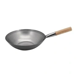 330(Ø)mm . 13(Ø)". Mild Steel. Silver. Steel construction evenly conducts heat . Flat base means room for more ingredients. Wooden handle stays cool for user safety. Hand wash only. Rustic appearance great for front of house cooking.