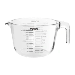 Glass. Clear. Tough and durable Borosilicate glass construction. Clear markings on outside of jug that won't fade over time. Suitable for temperatures between -20°C to +120°C . Thermal shock resistance up to 120°C. Stain and scratch resistant.