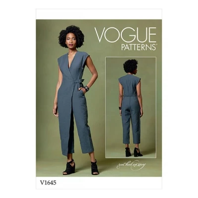 Semi-fitted, jumpsuit (close-fitting through bust) has mock wrap detail, side slant pockets, squared-off armholes and half self-belt. Recommended fabrics: Cotton Fabrics‚ Crepe‚ Denim Size: 42-48 EU Skill level: advanced Illustrated instructions in English and German are included. Size chart: Misses