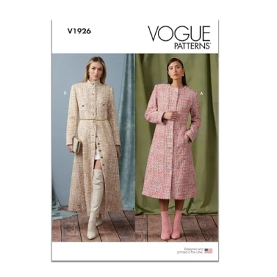 Sewing pattern packet comes with sewing templates, fabric recommendations, pattern pieces, sizing guides, and instructions Sewing pattern template for misses' sizes 18-20-22-24-26 Semi-fitted lined coat has long two-piece set in sleeves with working vents, shoulder pads, side front pockets, and side back and side front seams. Coat comes in length variations. View A is collarless coat. View B has stand collar and patch pockets Vogue sewing patterns are comfortable, confident, and modern; perfect for staying on top of today's fashion trends Vogue pattern sewing templates are proudly designed and printed in the USA